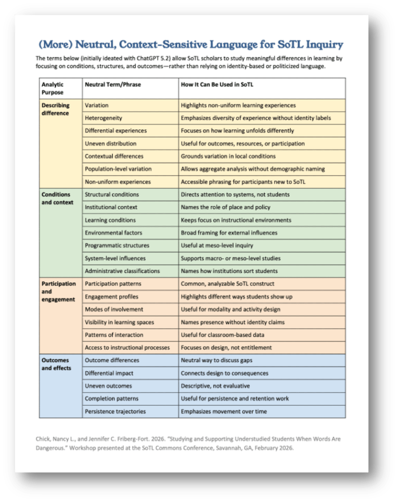 “(More) Neutral, Context-Sensitive Language for SoTL Inquiry“ offers language for studying meaningful differences in learning. Not only do these direct our attention to areas we need to learn more about, but they also give us options when identity-based terms aren’t possible or the most relevant. Rather than avoiding questions of difference, these options reframe how those questions are asked, shifting attention from student identities to learning conditions, structures, participation patterns, and outcomes. Doing so helps locate responsibility for differential learning in educational design and institutional structures, rather than implicitly in students themselves.